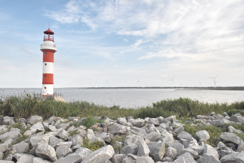 農場的東海岸,原是一個不起眼的扁擔港,因地勢不滑,沒有深水的場所,所以以前當地人出海時,就會選擇把魚具等物品挑進去,用扁擔再把海產品挑出來,所以久而久之就稱之為扁擔港。后因蘇北灌溉總渠的竣工和海口閘的先后興建,通過多年來的建設,在南側的蘇北灌溉總渠的海邊出現了蜿蜒淺流的水道;而在北側則是非常壯觀的海口閘,內側是清水透徹的河水,外側則是黃濁濁的海水,并在排水中的不斷碰撞中融合在了一起,那些隨河水而下的魚類則難以忍受這種環境,在不斷的顛簸中流入海中或是成為人們的美食。那些海邊的燈塔、一字排開的擋浪水泥桿、搖曳的大風車和深入到海水中的亭臺,無不成了觀賞風景中的唯美角色。