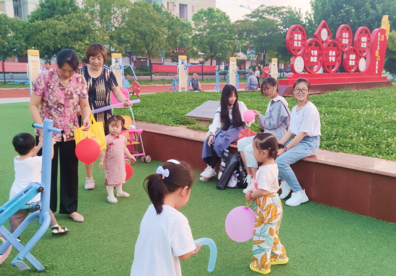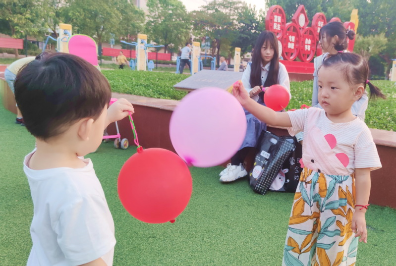 9月4日傍晚,在淮海農(nóng)場(chǎng)職工休閑體育運(yùn)動(dòng)廣場(chǎng)健身器材包裹的橢圓形的大理石上,由淮海農(nóng)場(chǎng)中學(xué)的三名學(xué)生正坐在上面一邊吹著氣球、一邊把色彩斑斕的氣球或是氣棒派送到前來索要的寶媽寶奶或是寶寶的手中,并以此來鍛煉體驗(yàn)與社會(huì)交往的能力,并在人際交往中奉獻(xiàn)愛心,體味人性的溫暖。