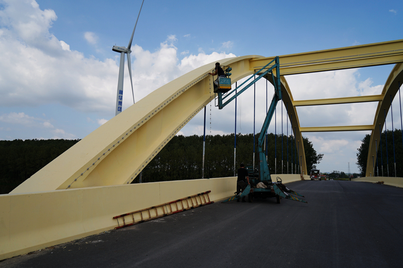 圖為工人正在為大橋安裝景觀燈