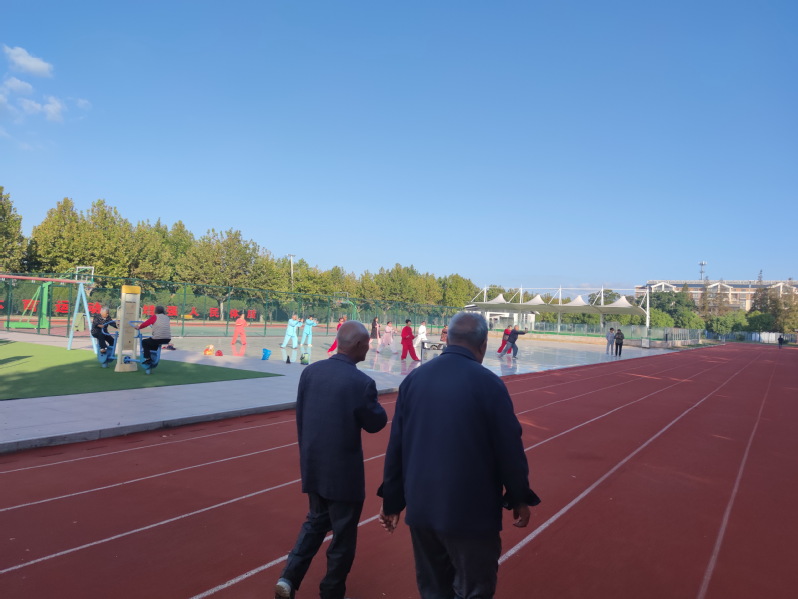 天上白云悠悠,太陽把藍天照耀得分外清爽;廣場內音樂陣陣,大家按照各自的健身規律進行著運動。我們注意到,有一個推著輪椅的老人和另一個老姐妹在相伴散步,瞧他們聊天的神態是那么的自然,交談起來甚歡。另外有兩個80多歲的老人,在塑膠步道上一圈又一圈的踱著步,以邁開腿的姿態進行健身。據這些都已經過了80歲的老年人講,他們每天都要來到廣場這里來走上七圈八圈的,這樣才能讓自己的身體時常充滿活力。