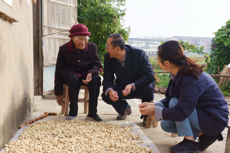 “老人家我們來看望您了。”淮海參加百歲老人慰問的一行人,當(dāng)天上午首先來到位于城東居委會渠星小區(qū)邱維珍老人的家中,當(dāng)他們看到老人正在門前分撿曬在地上的花生,一起圍著前去與老人打著招呼并噓寒問暖,并蹲在地上一邊陪著老人分撿花生,一邊與老人快樂地聊著。