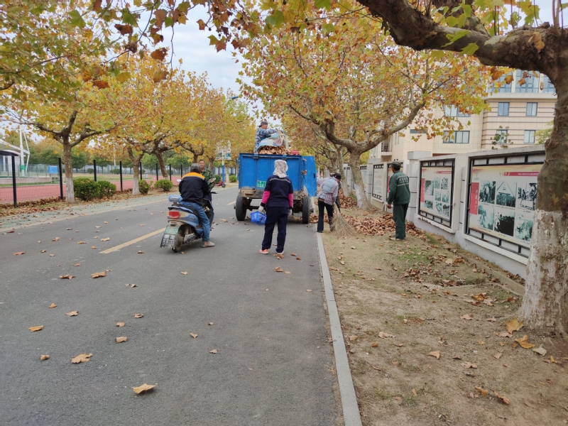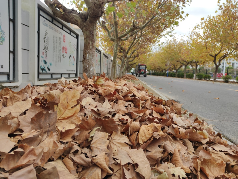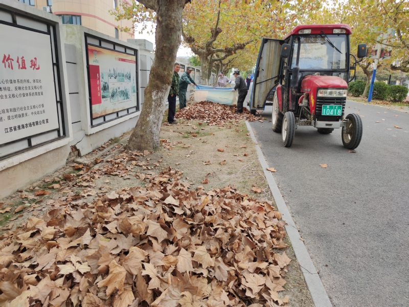 連日來(lái),隨著秋后霜降和大風(fēng)的侵襲,沿路梧桐樹、香樟樹的樹葉掉落了不少,有時(shí)隨著風(fēng)兒樹葉紛紛揚(yáng)揚(yáng)地飄蕩,給農(nóng)場(chǎng)路面的環(huán)境衛(wèi)生帶來(lái)的困擾。我們注意到,11月5日下午,在淮海創(chuàng)業(yè)路上,一車拖拉機(jī)和五六名環(huán)衛(wèi)職工,依次把清掃出來(lái)成堆的樹葉進(jìn)行打包裝車,將樹葉清理走,以保證農(nóng)場(chǎng)在遇到特殊的天氣條件下,仍然以較好的路道清潔質(zhì)量,來(lái)“刷新”農(nóng)場(chǎng)小城鎮(zhèn)的道路視覺環(huán)境。