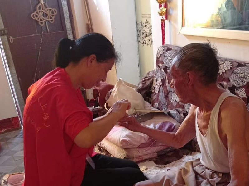 據(jù)了解,年齡達到80歲的老人,在淮海是極其龐大的一個群體,許多老人家庭、甚至一些孤寡老人因為子女不在身邊而承受著異常的孤獨,有時還要備受病痛的折磨。而淮海居家養(yǎng)老照護員的出現(xiàn)和居家養(yǎng)老社會服務的開展,無疑為他們開辟了一條親情式的服務通道,能讓他們在養(yǎng)老服務和社會各界的親情關(guān)愛中,享受頤養(yǎng)天年之樂和生活的美好。圖為金實銀康居家養(yǎng)老服務人員在上門服務時的鏡頭。