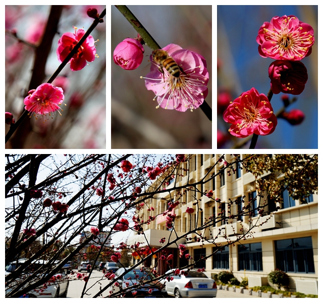 徜徉在新洋的金龍灣公園、機(jī)關(guān)大樓旁的后花園、中心河畔,但見那一朵朵、一株株、一片片的紅梅競相開放,把春天打扮得分外妖嬈,空氣中飄蕩著醉人的清香。