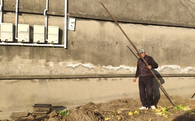 圖為老黨員李宗加將最后一根蔬菜爬藤架子拆除移走