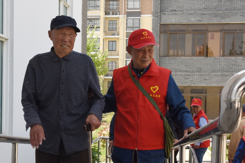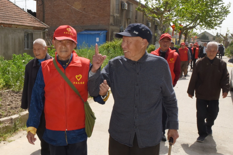 5月8日下午2點多鐘,一名剛跨入80歲這個耄耋年齡段的黨員林耀國,以淮海農場社區城西居委會黨支部的一名志愿者的身份,陪伴性地攙著一位95歲的老軍墾戰士魏廣友,同其他15名平均年齡達90歲的原中國人民解放軍農業建設第四師的老戰士們一起,來到城西支部上黨史學習教育課,課后并到當年的農建四師師部舊址上,瞻仰紀念碑、聆聽主席令、參觀陳列館,幫助老軍墾在尋找、敘說曾經的記憶和榮耀過程中,踐行黨的歷史,并以此來不忘初心,牢記使命,更好地講好淮海紅色故事,傳承好農建四師精神,讓軍墾精神在淮海農場大地上發揚光大。圖為穿著志愿者服裝的林耀國老人在陪伴老人行進時的鏡頭。