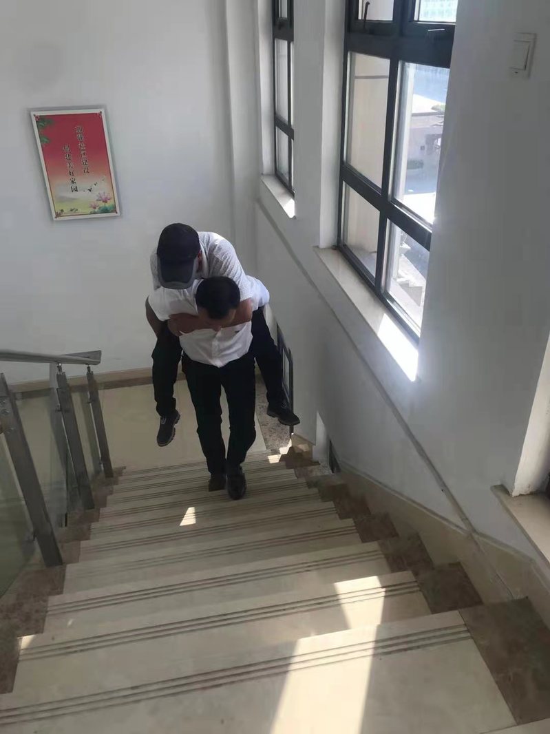 下午4時許,一位近60歲的右腿殘疾村民,滿頭大汗、步履艱難地來到社區(qū)一樓大廳,右手緊緊握著樓梯扶手,準備上至三樓進行接種。看到他蹣跚挪步時的鏡頭,大廳工作人員紛紛站立起來準備上前進行攙扶時,社區(qū)工作人員、城西黨支部副書記董偉一個健步?jīng)_了過去說:“我是共產(chǎn)黨員,我個大,我來背!”說完,他走到該村民身邊,蹲下身上,叫這位村民趴在他的背上,然后手托著屁股,一步一步地走上了三樓的疫苗接種室。