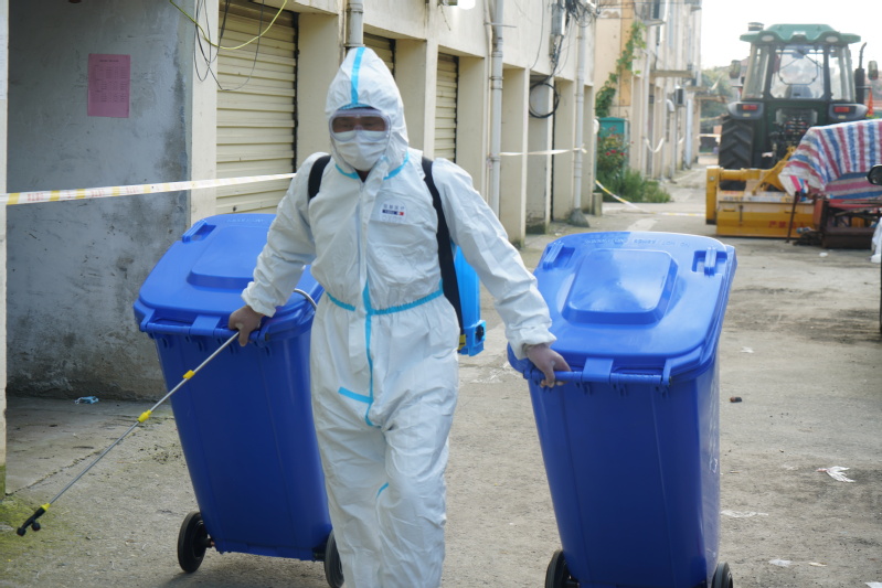 葉微是三河環(huán)衛(wèi)的負責(zé)人,每天,他帶著環(huán)衛(wèi)工人進入各個小區(qū)進行垃圾清運,這其中也包括重點管控區(qū)域的垃圾清運和處理,在重點管控區(qū)域的垃圾清理中,葉微每天自己穿著防護服進入小區(qū),先將垃圾筒進行消毒,再對兩幢樓的樓道消毒,隨后醫(yī)務(wù)人員對兩幢樓的住戶進行體溫檢測,葉微一個人把四個垃圾筒消毒后,再把垃圾筒拖到垃圾車旁將垃圾裝入車中,然后再對垃圾筒進行消毒,再拖回原位置,整個過程在五十分鐘左右。當(dāng)完成全部工作脫下防護服時,葉微身上的汗水已經(jīng)順著褲管往下流,整個衣服全部濕透下,脫下防護服的第一件事便是找個地方坐下來休息片刻。