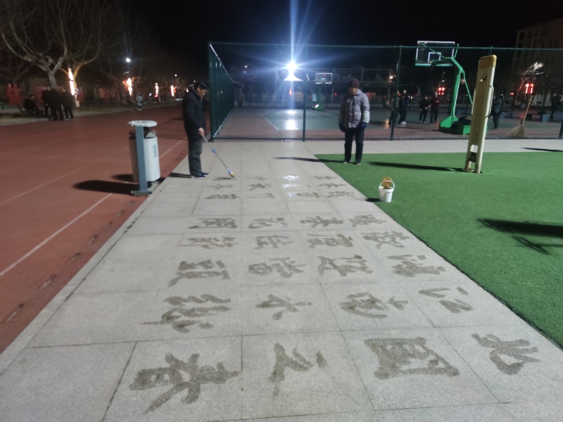 在淮海職工休閑體育運動廣場上,我們在夜晚燈光下在廣場散步時,經??梢钥吹揭粋€中年人正在專心致志地在廣場大理石的地面上寫地書。只見他用一種如椽大筆在大理石上書寫著,這種地書筆有長長的桿子,用海綿做成的特殊筆頭,既能方便環保,又不用紙墨,只是用一個小桶拎著水,就可以蘸水在地上寫字。