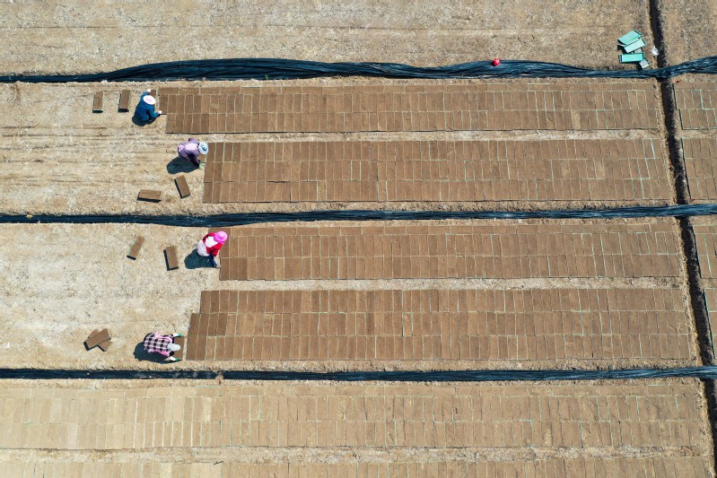 5月1日,寶應湖農場三分場場頭一派忙碌,擺盤、鏟土、倒稻種,7、8名工人分工合作,有序進行著落谷育秧。