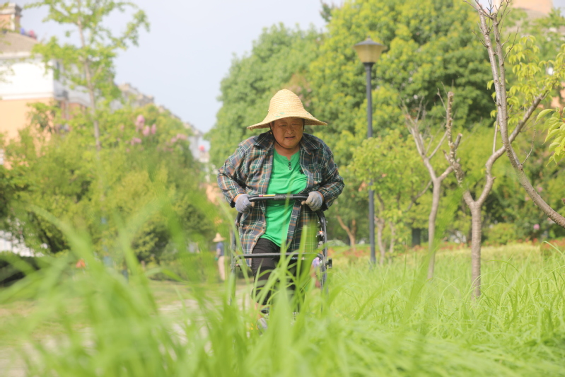 7月27日,寶應湖農場職工文化公園,7名工人正在為公園綠化除草。越是高溫雜草長得越旺。以席正英為隊長的綠化員們分工合作。草坪上用電動切草機清理,隨著“隆隆”的機聲,切碎的草屑在刀頭間飛濺,濺到了工人的身上、飛上了工人的臉龐,刺癢刺癢,淡淡的青草味洋溢在夏日的晨光里。綠化帶里,爬騰類的雜草枝枝蔓蔓,覆蓋的綠化樹上,工人們就用手先拉斷經脈,再扯掉枝葉;低矮類的雜草擁擠在綠化樹間,工人們蹲下身子就用手拔、用刀割。當天7名工人清理綠化300多平方米。