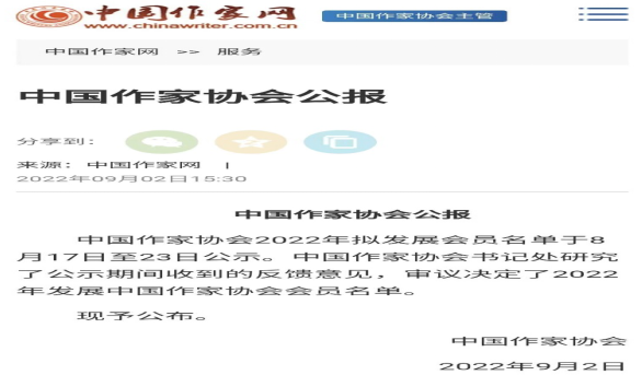 近日,根據(jù)中國作家協(xié)會公報,中國作家協(xié)會2022年擬發(fā)展會員名單于8月17日至23日公示。中國作家協(xié)會書記處研究了公示期間收到的反饋意見,審議決定了2022年發(fā)展中國作家協(xié)會會員名單,并于2022年9月2日進行公布。其中江蘇60人,江心沙農(nóng)場有限公司90后職工袁偉榜上有名。