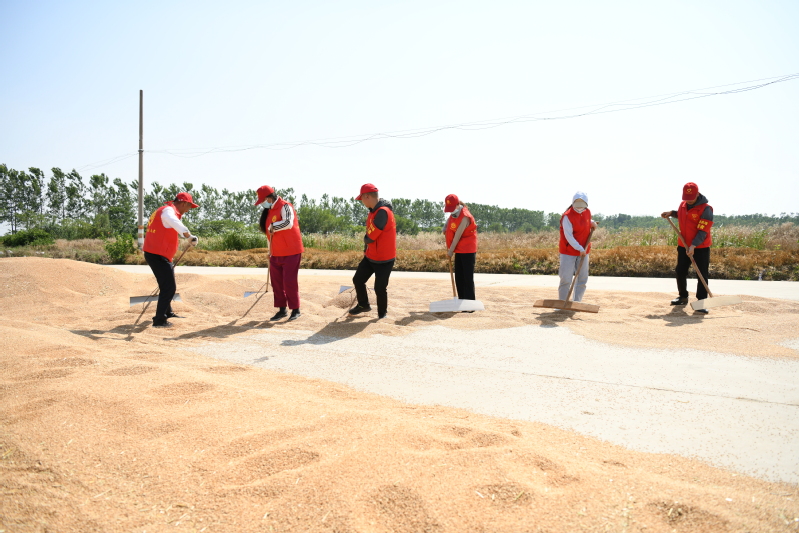 沖鋒在前,做好“助收員”。聞令而動(dòng)、依令而行,社區(qū)黨組織組織黨員干部深入三夏工作一線,幫助生產(chǎn)區(qū)搶收晾曬,曬場(chǎng)上,大家頂著烈日,及時(shí)翻、晾登場(chǎng)小麥。