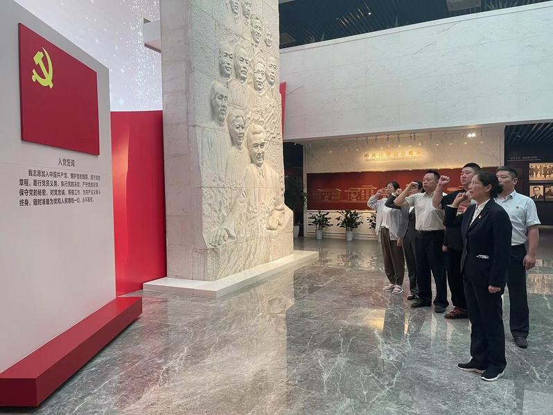首先,全體黨員來到陳列廳正中央,面對漢白玉浮雕和鮮紅的黨旗重溫入黨誓詞,回顧入黨時的莊嚴承諾和初心使命,進一步增強理想信念。隨后,全體人員參觀了國共南京談判史料陳列館,認真觀摩館內陳列的歷史文獻、展板、影像等,在一幅幅泛黃的照片、一件件簡樸的實物、一段段珍貴的影像資料前駐足凝視。周恩來戴過的禮帽、代表團的戶口卡、董必武的銅墨盒,一件件珍貴的文物,帶領大家穿越時光,回到共和國誕生前的至暗時刻,讓大家切身感受了以周恩來為代表的共產黨人高尚的品格情操、堅定的理想信念、無畏的革命精神。隨后大家不約而同地駐足在習總書記在紀念周恩來同志誕辰120周年座談會上對于周總理褒獎的文字前,這“六個杰出楷模”正是應當樹立的標桿和榜樣。參觀結束后,支部黨員們集體過“迎七一,共憶入黨初心”政治生日,支部書記為大家發放“政治生日”賀卡,勉勵大家要進一步強化身份意識、宗旨意識和責任意識,恪守初心使命,永葆政治本色,永遠跟黨走。