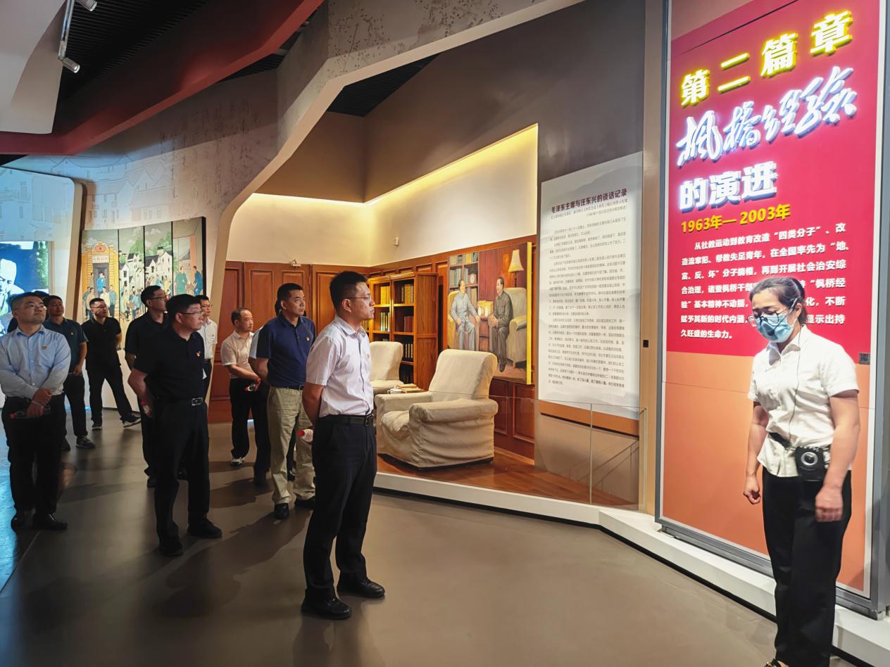 在諸暨市楓橋鎮,通過參觀楓橋經驗陳列館、聆聽楓橋經驗創始人的嫡系傳承人的精彩講解,全體人員進一步了解了“楓橋經驗”的歷史溯源和楓源村、杜黃新村等村集體的創新實踐,深刻領會了新時代“楓橋經驗”“矛盾不上交、平安不出事、服務不缺位”的理念。