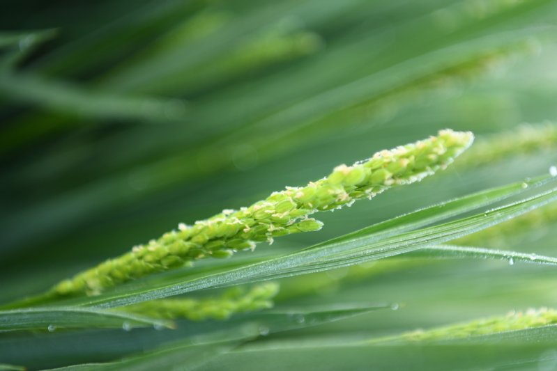陽(yáng)光下,霧氣散,空氣中彌漫著清新的稻花香。俯瞰蔥綠的稻田,如一條條綠絲帶整齊排列。晶瑩的晨露凝結(jié)在青翠的秧苗上,猶如給稻田蒙上了一層剔透的面紗。剛抽出的稻穗上,有白色的稻花點(diǎn)點(diǎn),隨著稻穗一起隨風(fēng)輕舞飛揚(yáng)。小蜘蛛也趕來(lái)湊個(gè)熱鬧,在枝葉上織起了“秋的毛衣”。