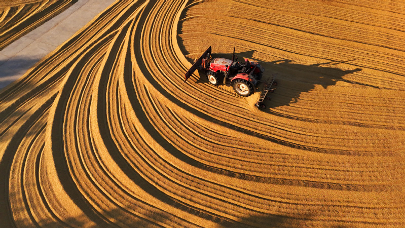 江蘇省連云港市海州區云臺農場工作人員搶抓晴好天氣翻曬稻谷(10月28日攝,無人機照片)。“新筑場泥鏡面平,家家打稻趁霜晴。”金秋時節,各地迎來豐收季,農民抓住晴好天氣收割收獲晾曬谷類作物,田間地頭呈現一派忙碌的豐收景象。新華社發 耿玉和 攝