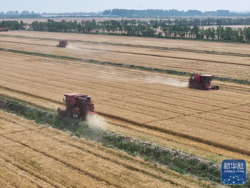 5月28日,收割機在三河農(nóng)場收割小麥(無人機照片)。新華社記者 季春鵬 攝