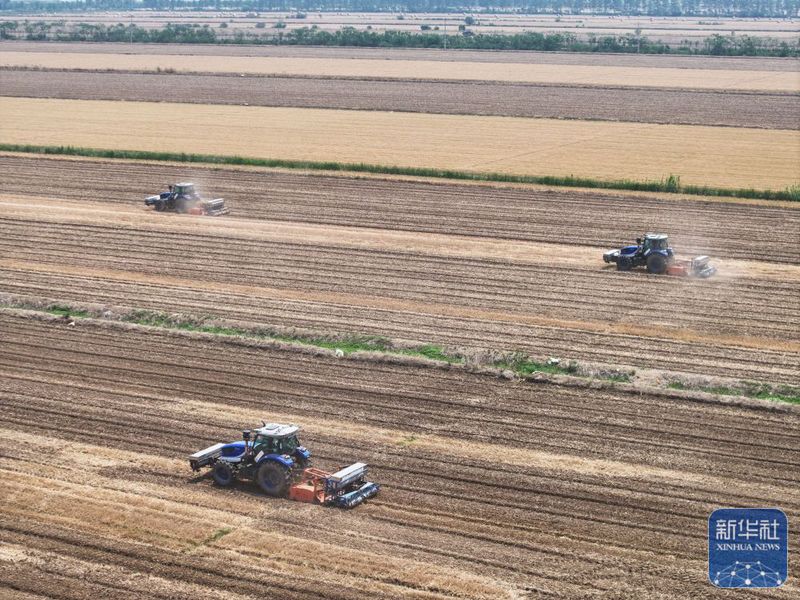 5月28日,揚州大學研制的“九合一”稻麥耕播機在三河農(nóng)場播稻種(無人機照片)。新華社記者 季春鵬 攝