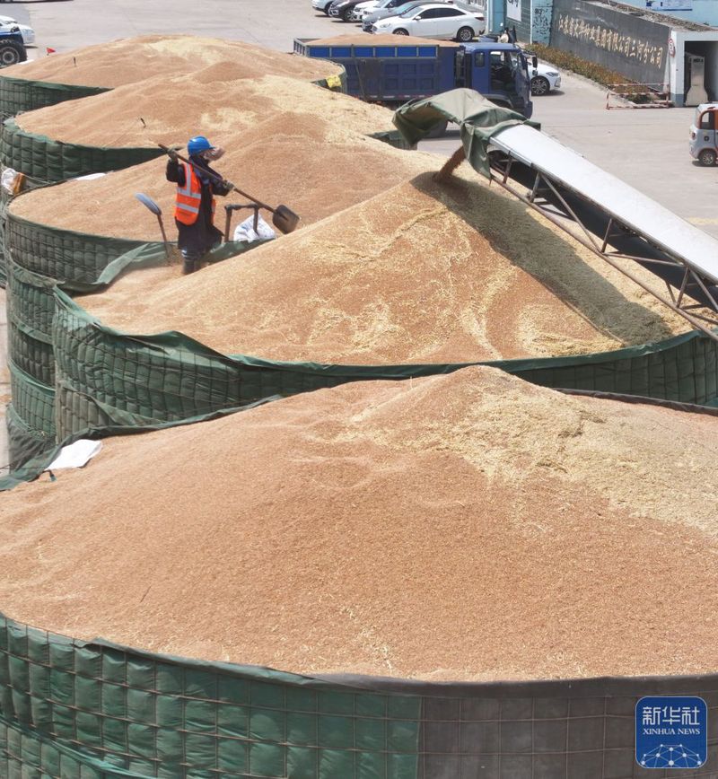 三河農(nóng)場收獲的小麥進入大華種業(yè)三河分公司存儲(5月28日攝,無人機照片)。新華社發(fā)(許昌銀攝)