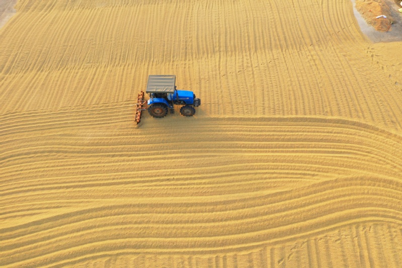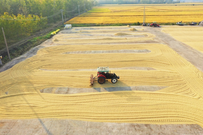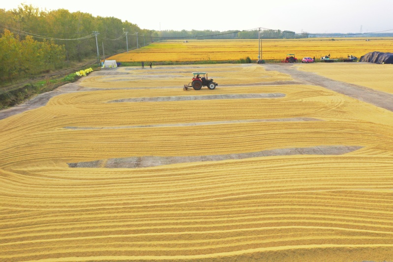 10月27日,位于江蘇省連云港市海州區的江蘇農墾崗埠農場,職工駕駛糧食翻曬機械在場面上來回穿梭,翻晾曬剛剛收獲的水稻。