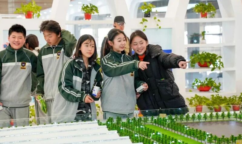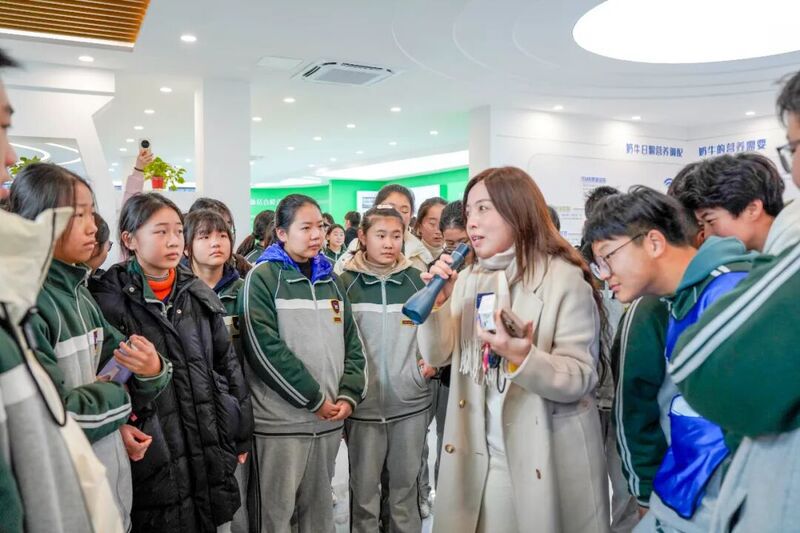 “原來奶牛是這樣擠奶的!太神奇了……”在可視化擠奶廳里,師生們的驚嘆聲此起彼伏。兩座全自動轉盤式利拉伐擠奶機正在運轉,一頭頭黑白花奶牛有序走上轉盤,擠奶員則熟練地進行著前藥浴、驗奶、套杯、后藥浴等標準化操作,整個流程清晰直觀地呈現在眾人眼前?!袄蠋煟@些奶牛每天能產多少奶呀?”一名戴眼鏡的男生舉手提問。講解員小張笑著解答:“一頭牛最高可以產70公斤牛奶,產出的牛奶都要經過100多項指標檢測,達標合格后才能走向市場。”在智慧化生態展廳,師生們既能通過圖文展板系統學習奶牛品種特性、科學飼養方法及飼料配方等基礎知識,又能通過蘇墾乳業數字牧場展示平臺實時查看每頭奶牛的身份檔案、生長曲線、產奶數據及健康監測指標,沉浸式感受科技為傳統養殖業帶來的變革。“這次研學真是讓我親眼看到了科技養牛的力量,原來一杯好牛奶的誕生背后,藏著這么多學問!”一位帶隊老師感慨道。