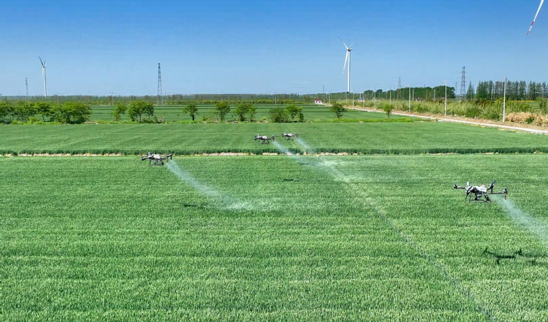 在蘇墾農發新洋分公司新北生產區高標準農田,五臺滿載生物藥劑的北斗導航植保無人機正沿著預設航線精準噴灑葉面肥,多光譜測繪無人機同步監測苗情長勢,全力守護麥田健康。新洋分公司將綠色防控與統防統治有機結合,所有基層一線青年員工全部掌握無人機操作技術,實現了近6萬畝農田的飛防作業全覆蓋。目前,共引入更新大疆T70、T100等新型無人機23臺。