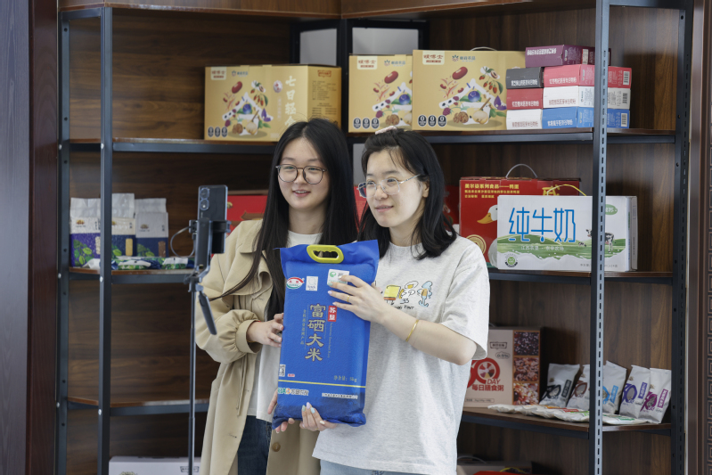 新洋農(nóng)場(chǎng)美爾姿創(chuàng)新“線下體驗(yàn)+線上便捷”雙渠道聯(lián)動(dòng)模式,實(shí)現(xiàn)線上線下融合運(yùn)營(yíng),既提升品牌影響力,又讓消費(fèi)者品嘗到墾區(qū)優(yōu)質(zhì)農(nóng)產(chǎn)品。圖為主播在直播間推薦農(nóng)副產(chǎn)品。